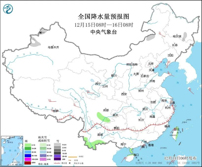 12月15日8时至16日8时,新疆塔城和伊犁河谷、内蒙古中部、川西高原东南部等地部分地区有小雪或雨夹雪,其中,新疆塔城部分地区有中到大雪(5~8毫米)。四川南部、云南北部和西部、台湾岛等地部分地区有小雨。青海南部部分地区有4~5级风,东海、台湾海峡、南海中北部、北部湾等海域有7~8级风。