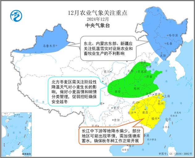 预计12月以来,北方冬麦区冷空气活动频繁,对冬小麦抗寒锻炼有利,但大部地区气温仍较常年同期偏高,预计冬小麦越冬期将出现在12月中下旬,较常年同期略偏晚。依据冬小麦播种日期及越冬前形成旺苗的积温指标推算,陕西咸阳、宝鸡、渭南,河南洛阳、平顶山、周口,山东烟台、青岛等地部分冬小麦越冬前旺长的风险较高。