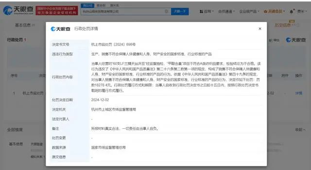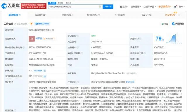 处罚事由显示,当事人经营的“60支LF兰精天丝床笠”经监督抽检,“甲醛含量”项目不符合A类纺织品要求,检验结论为不合格。杭州山姆会员商店有限公司成立于2020年4月,法定代表人为郑硕怀,注册资本450万美元,经营范围含药品零售、第三类医疗器械经营、食品销售等,由沃尔玛(中国)投资有限公司全资持股。
