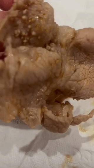此前,有网友在社交平台上称,其11月12日在上海嘉定山姆会员超市购买了山姆猪梅花肉火锅片,吃到一半却发现猪肉片上有很多一粒一粒的白色疙瘩,看起来甚至像是虫卵,非常恶心。