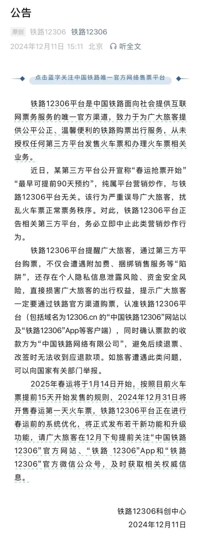 铁路12306平台正告相关第三方平台,务必立即终止此类营销炒作行为。