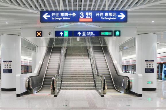 乘坐电梯上行至北京朝阳站交通枢纽后