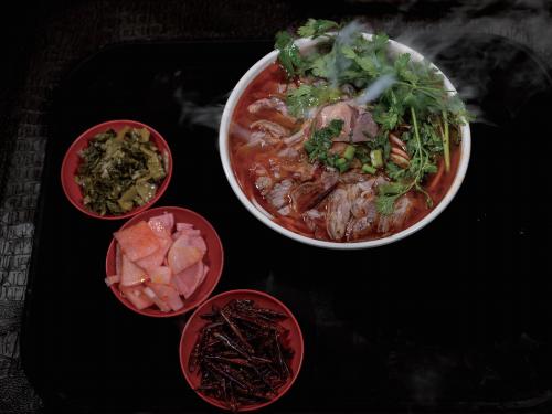 搭配小菜的热气腾腾的金沙羊肉粉选用毕节本地辣椒,香而不辣,晒干磨碎后佐以羊油炒制。火候不到,辣椒生嫩;火候过了,辣椒糊苦,而这一切的掌握,全凭代代摸索、相传的经验。