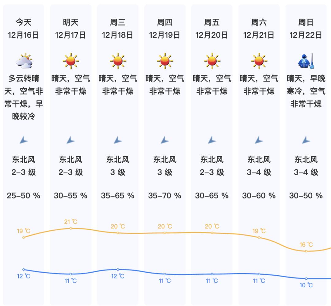 16-20日(周一至周五)晴天干燥为主,昼夜温差大,早晚持续较冷,其中16-18日,白天气温逐日上升;
