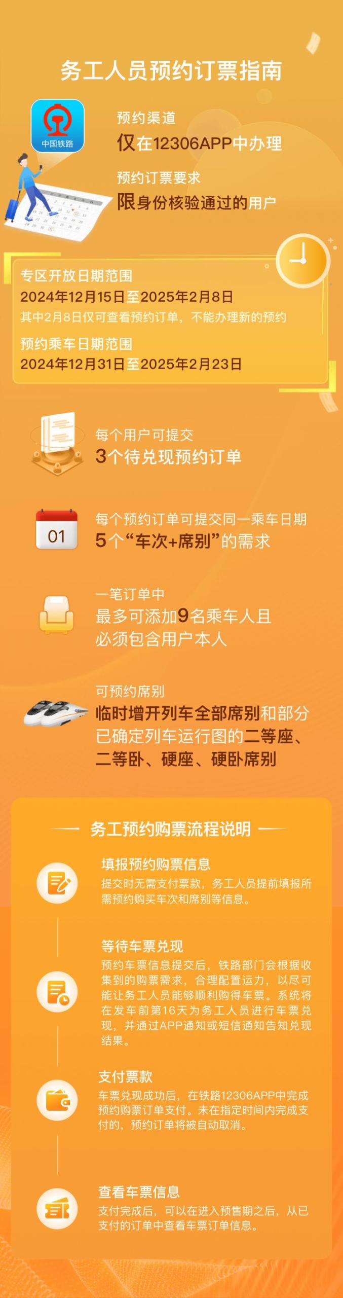 2024年12月15日至2025年2月7日,已通过实名制核验的务工人员可在铁路12306手机客户端“务工人员春运预约购票服务”专区,预约购买2024年12月31日至2025年2月23日的火车票。同一账户最多可同时提交3个订单,每个订单可添加1个乘车日期的5个“车次+席别”的组合,最多可为包含本人在内的9名旅客预约;