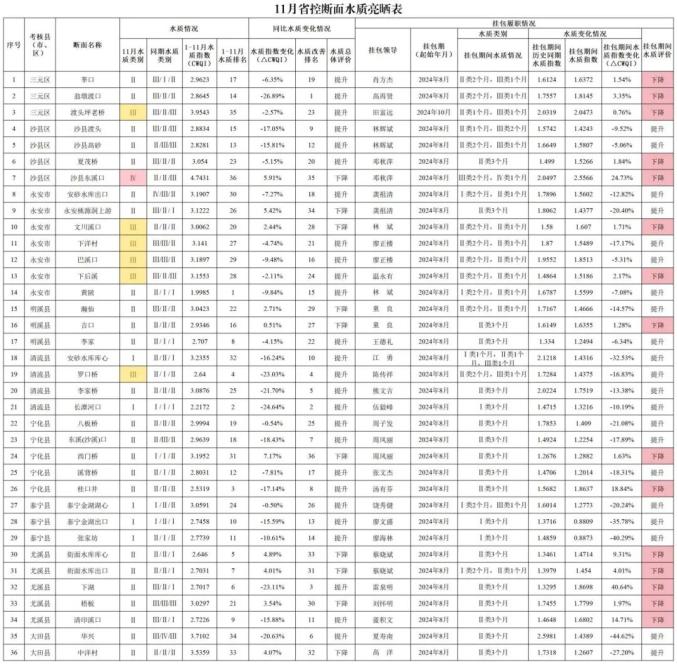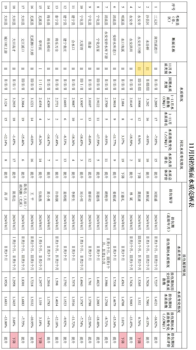 国控断面19个,其中,挂包期间断面水质提升15个,下降4个。11月,水质达标断面19个(Ⅰ—Ⅲ类);优质水断面(Ⅰ—Ⅱ类)17个,Ⅲ类水质断面2个〔水汾桥(沙县,挂包领导:林辉斌)、永安贡川桥(永安,挂包领导:龚祖清)〕。
