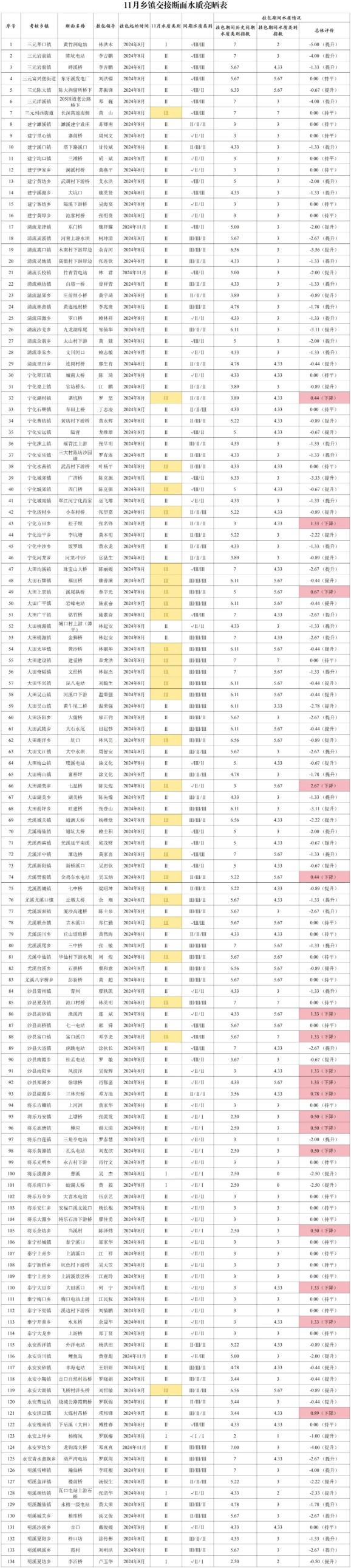 乡镇交接断面134个,其中,挂包期间断面水质提升115个,下降19个。11月,水质达标断面134个(Ⅰ—Ⅲ类);优质水断面108个(Ⅰ—Ⅱ类),Ⅲ类水质断面26个,分别是: