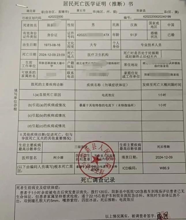 陈勇的中学同事们把他背到救护车能到达的地方,医生说已经没有抢救的必要了。在家属坚持下,他被送到医院,经过抢救后还是被宣布身亡。死亡推断书显示,直接死亡原因为“电流效应”。