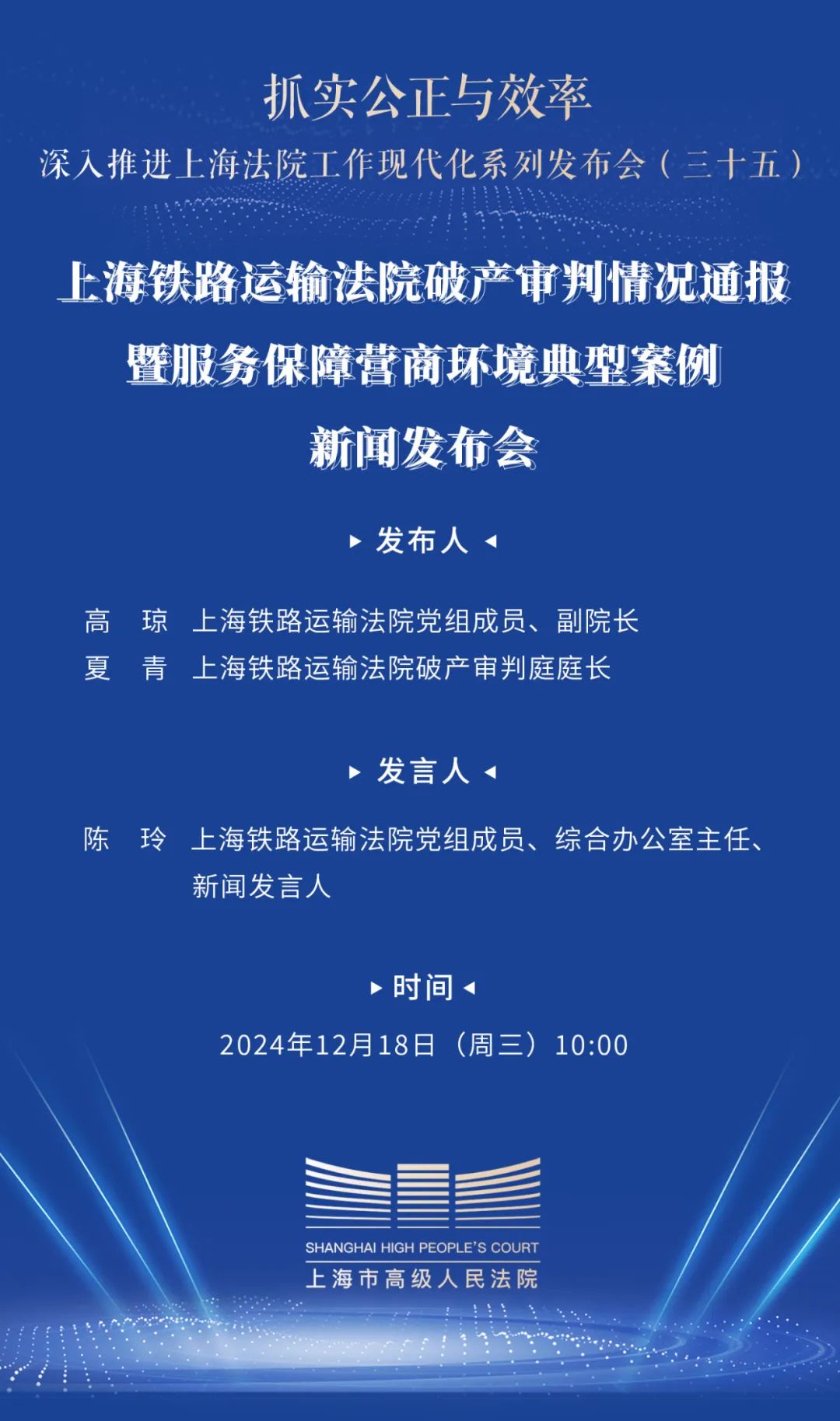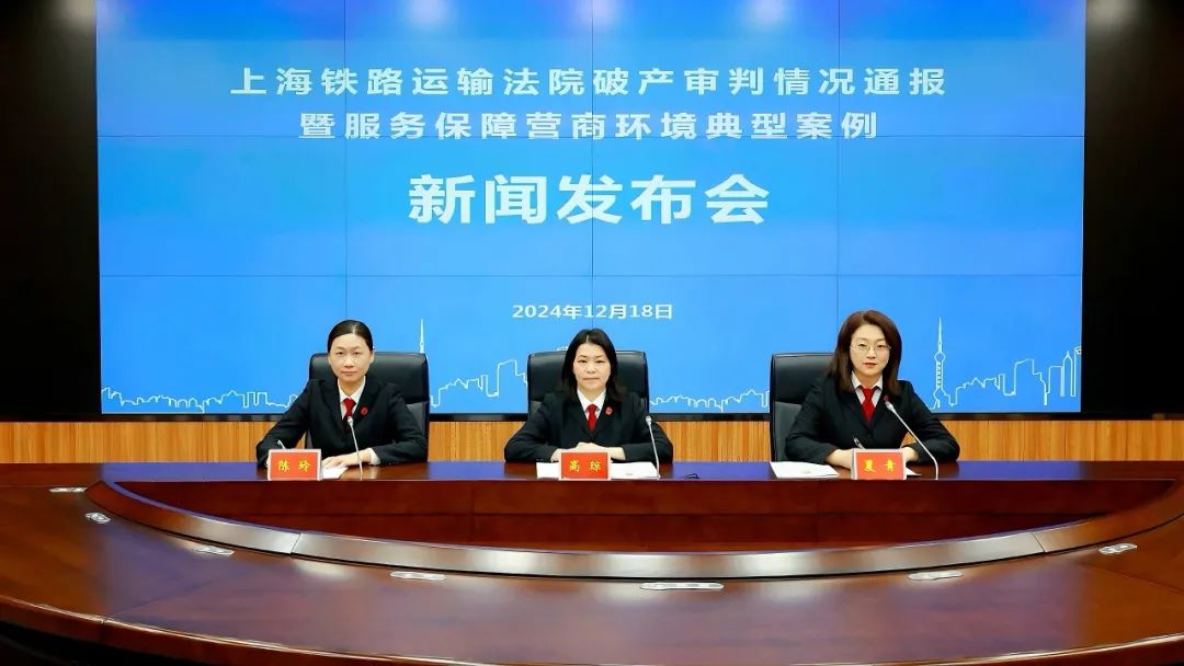 今天(2024年12月18日)上午,上海铁路运输法院(以下简称“上铁法院”)召开新闻发布会,通报该院2023年1月至2024年10月间破产案件审判情况,并发布典型案例。本场发布会是上海法院“抓实公正与效率——深入推进上海法院工作现代化”系列发布会的第35场。上铁法院党组成员、副院长高琼,上铁法院破产审判庭庭长夏青出席发布会,上铁法院党组成员、综合办公室主任陈玲主持发布会,上海市政协常委方奇钟、徐汇区人大代表王育松及多家媒体代表参加发布会。