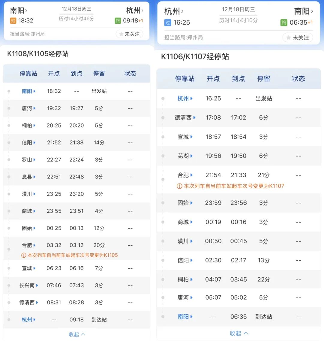 该趟车原为南阳地区首趟进沪列车,于2011年1月11日正式开行,早期终到始发上海站,之后常年开行的具体方向为南阳至上海南K1108/5次和上海南至南阳K1106/7次。自今年7月1日三季度铁路调图后,该车终点站由上海南站变更至杭州站。