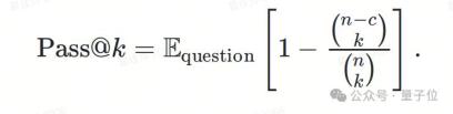 经典的Pass@k指标关注模型在多次生成中至少给出一次正确答案的概率。假设模型生成次数为,正确答案数为,c表示其中正确解的数量,那么Pass@k的计算方式如下: