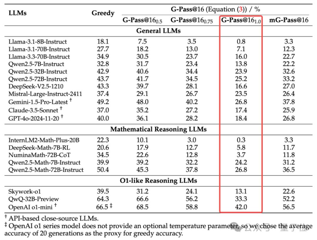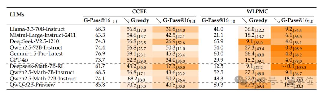 研究人员对当前主流的约20个模型进行了测试,发现尽管多数模型在贪婪解码的准确率Greedy Accuracy和Pass@16上表现相对较好,但当使用G-Pass@K指标进⾏评估时,性能却显著下降。