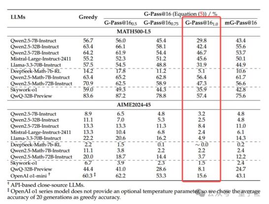 大部分闭源模型和开源模型在G-Pass@161.0指标上也都不超过30分。
