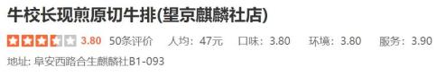 大众点评上,牛校长现煎原切牛排有两家店,其中一家是望京麒麟社店,已开业;另一家是中关村领展店,尚未开业。