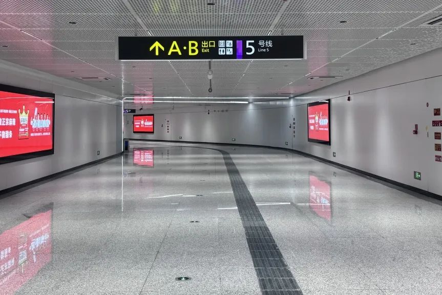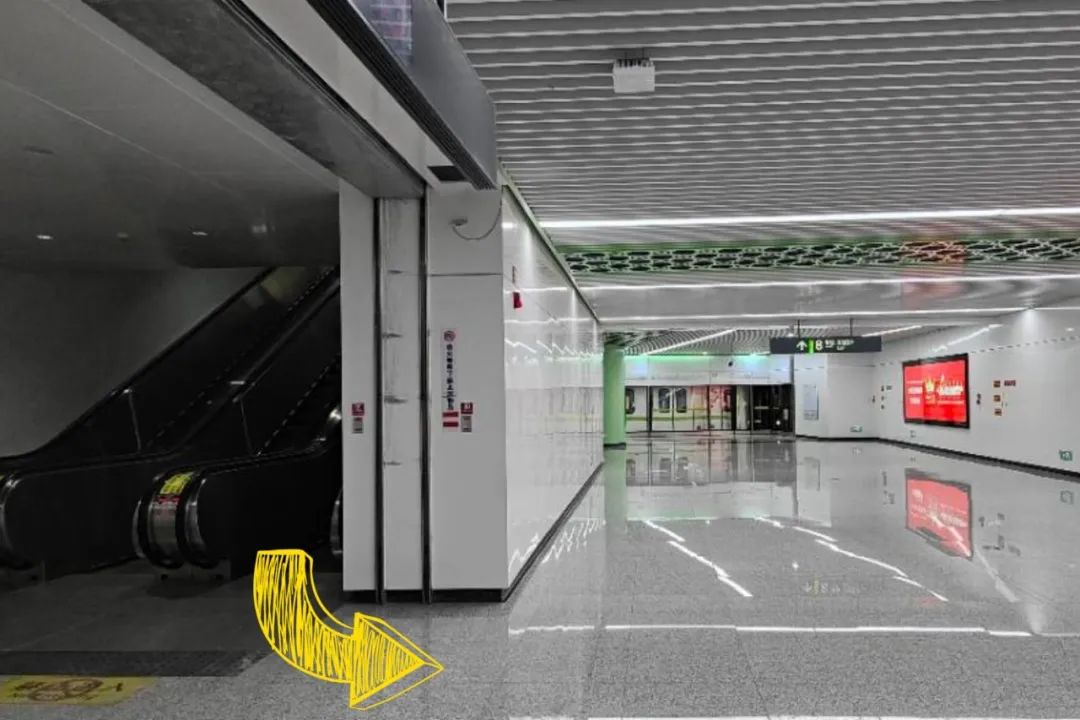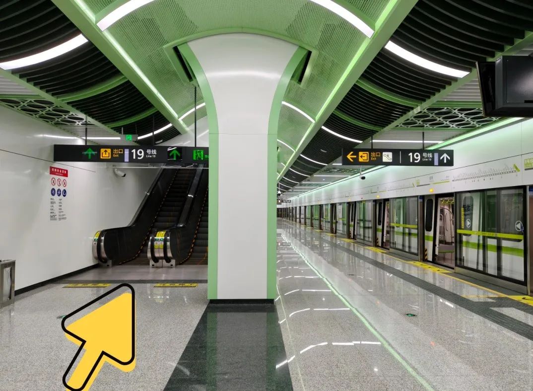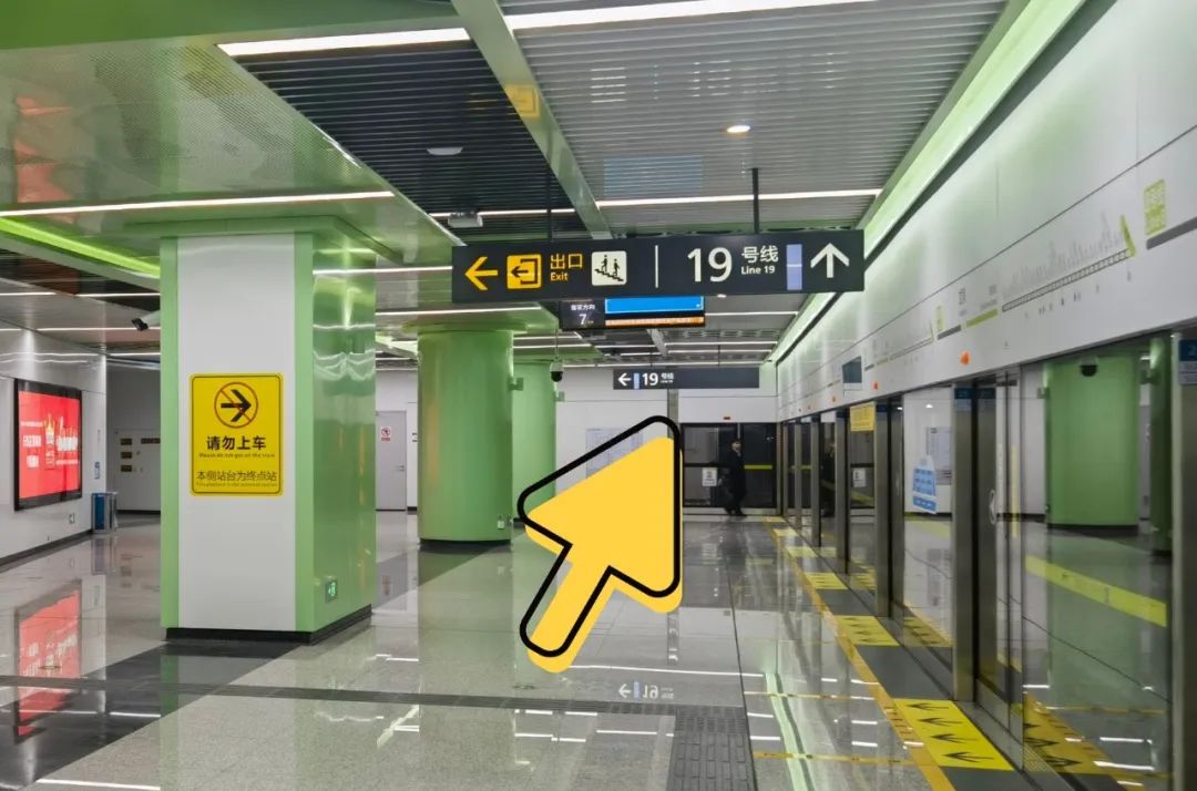 路径二:在8号线龙港方向站台,根据导向标识,乘坐站台中部的直梯或扶梯来到站厅,再通过导向标识的指引乘坐扶梯前往19号线站台。