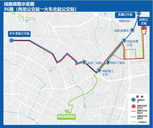 运营优化措施:(1)调整后原北湖公交站乘客可乘坐20路或112路至地铁十里店站换乘86路;原崔家店路乘客可乘坐8、20路,前往地铁4号线双桥路站。(2)线路调整后86路高峰频率提升至5-8分钟/班。