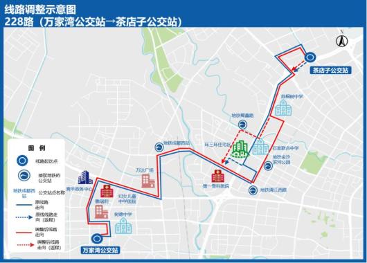 (返程)茶店子公交站至黄苑街口站行驶路线及站点不变,调整经西三环路四段、蜀江路、蜀鑫路后回原线路运行至万家湾公交站(终点站)。