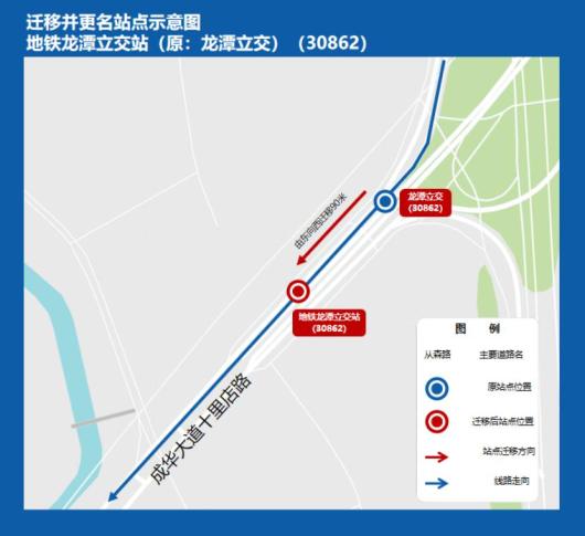 同时将由“成华大道民兴路口”(31939)更名为“地铁圣灯公园站”(31939),涉及线路:K16、303、112、86、20、349、654、662路;将“龙潭立交”(30862)由东向西迁移约90米并更名为“地铁龙潭立交站”(30862),涉及线路:86、K16、303、349、20、112、654、662路;