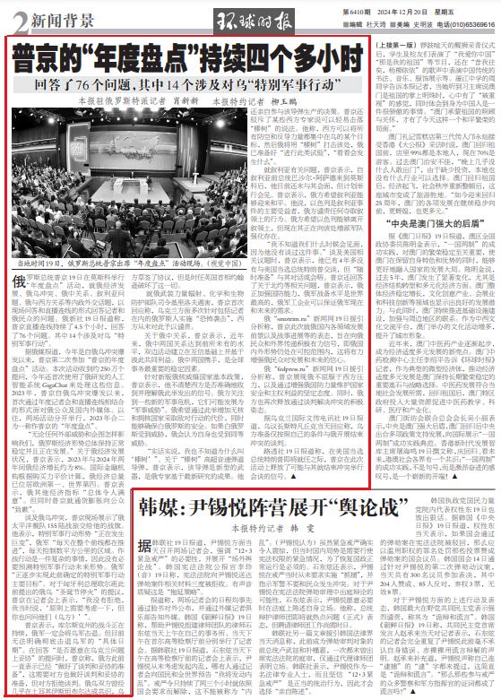 俄罗斯总统普京19日在莫斯科举行“年度盘点”活动,就俄经济发展、俄乌冲突、俄中关系、叙利亚问题、俄与西方关系等内政外交话题,以现场问答和直播连线的形式回答记者和俄民众的问题。俄新社19日报道称,普京直播连线持续了4.5个小时,回答了76个问题。其中14个涉及对乌“特别军事行动”。