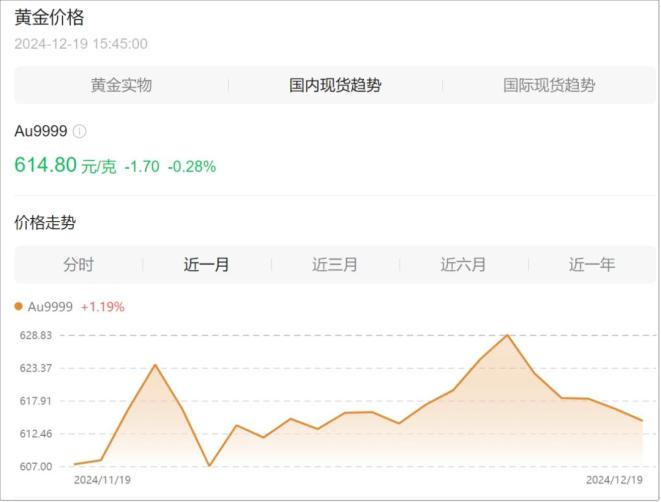 19日,国内黄金价格一度跌至610.11元/克,跌幅-1.00%。