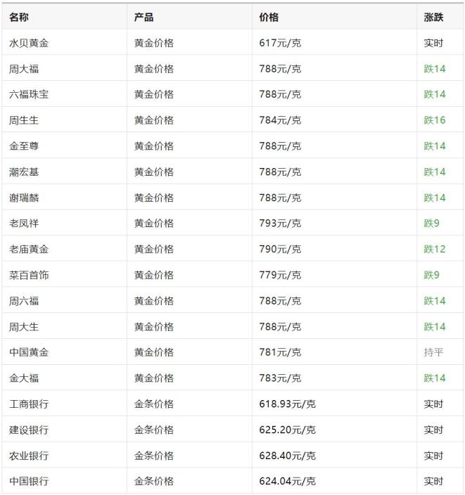 据统计,12月19日,国内各品牌金店黄金零售价格最高下跌16元,黄金首饰价格每克在629元至793元区间(工费另计),投资金条价格每克625元左右,白银价格7.1元/克。各大品牌金店黄金零售价格一览:
