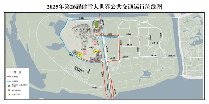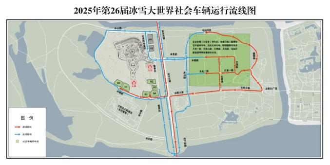 公路大桥—松北大道—太阳大道—麒麟街—太阳石停车区域、月亮一路、月亮二路沿线停车区域,停车后就近乘坐接驳车到冰雪大世界园区。