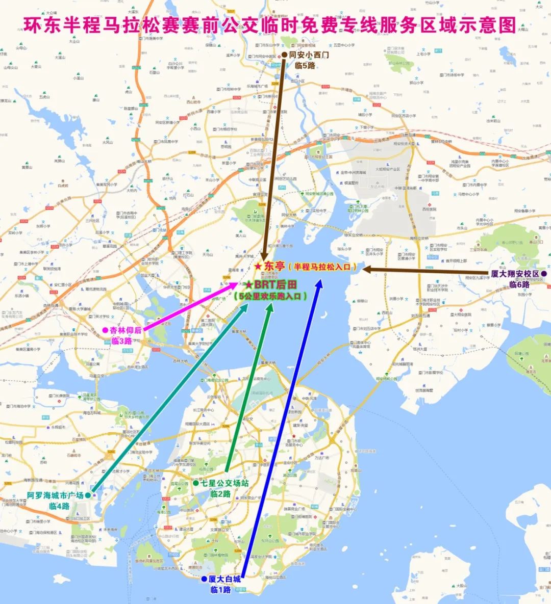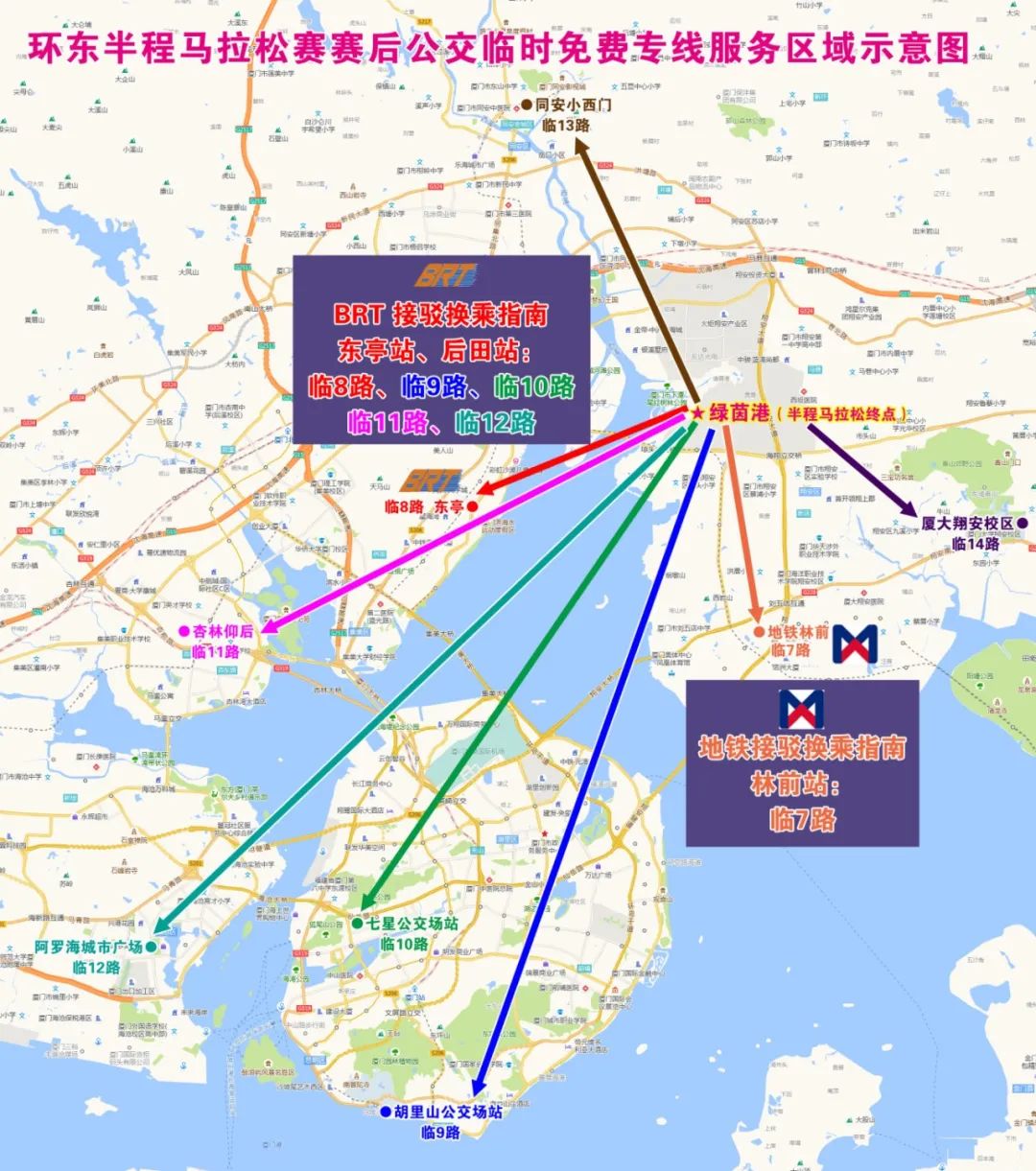 赛事终点上客区——万家春路的“绿茵港”站(即常规公交“翔安湿地公园”站西侧站点周边)