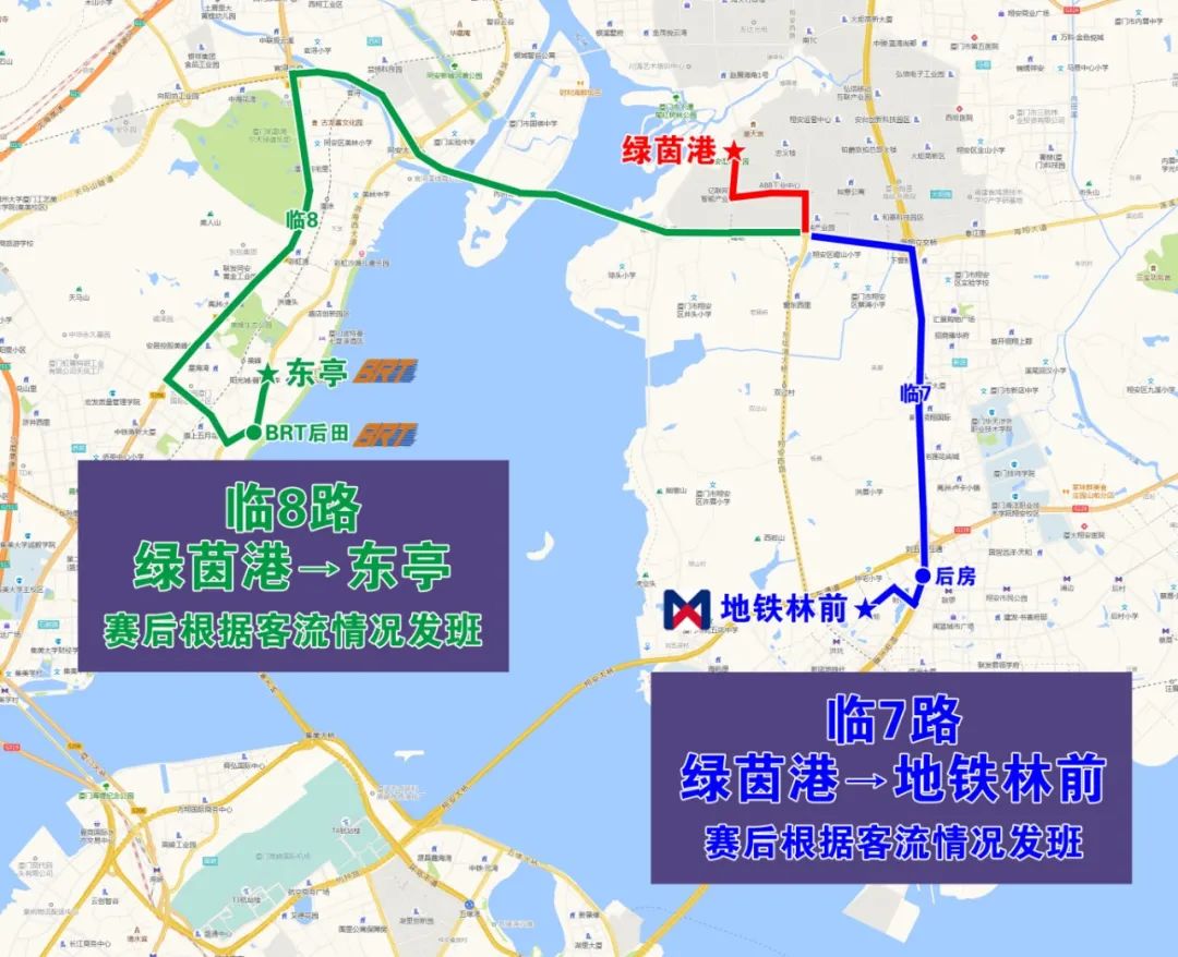 东亭站、后田站:临8路、临9路、临10路、临11路、临12路5条线路至“东亭”站或“BRT后田”站换乘BRT快2路、快5路、快7路。