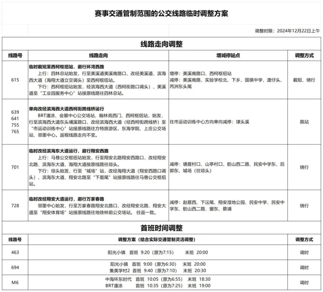 2024年12月21日22时起同安区观波路、观涛路观滨路路口至滨海浪漫线段、观浪路观滨路路口至滨海浪漫线段,禁止车辆通行,放置2024特步厦门环东半程马拉松赛《车辆通行证》的车辆除外。