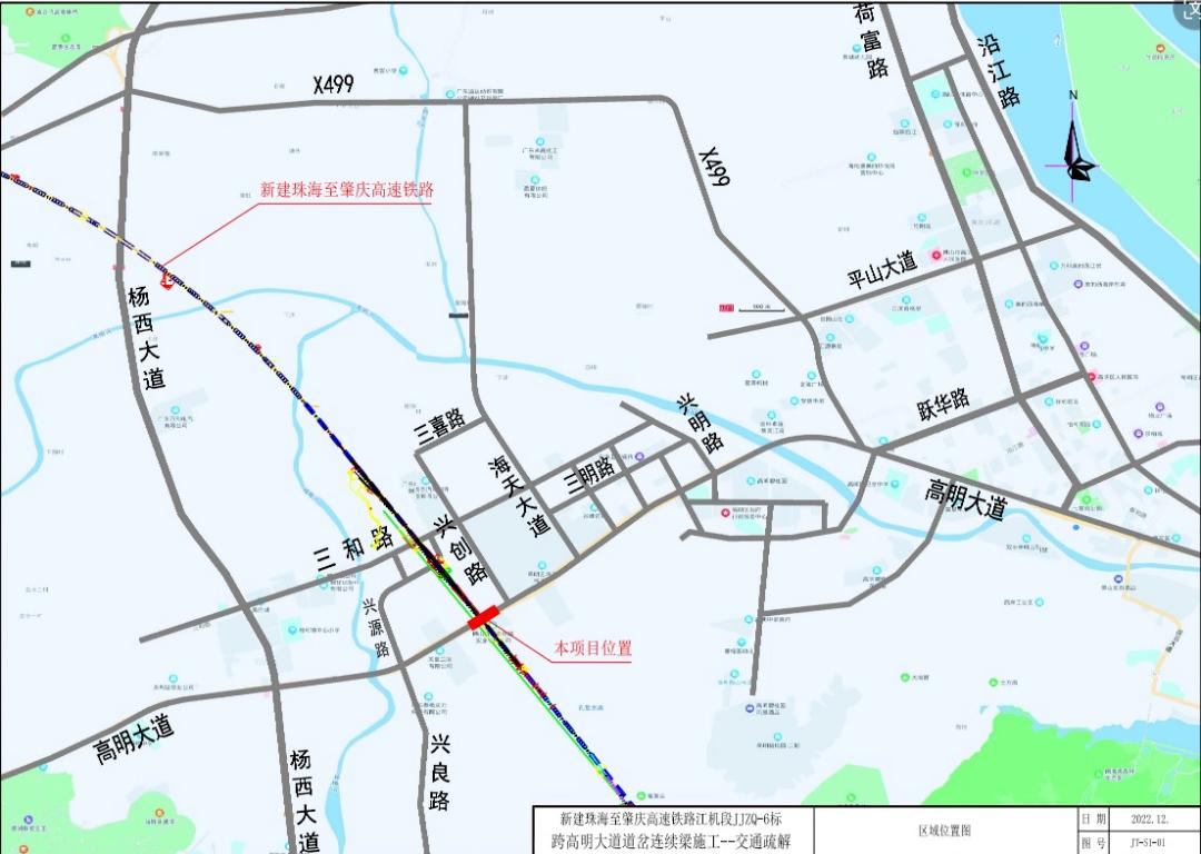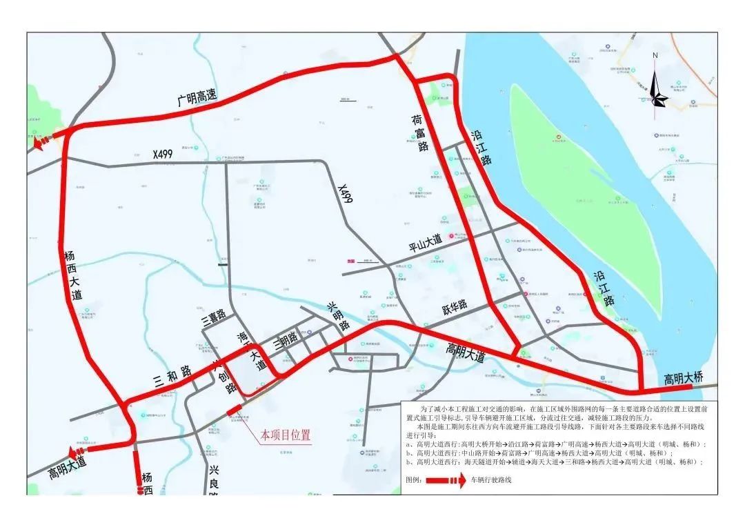 珠肇高铁跨高明大道施工已经进入尾声,即将进行第五阶段施工,对应高明大道交通通行路线将有所调整,现将调整有关事项公告如下: