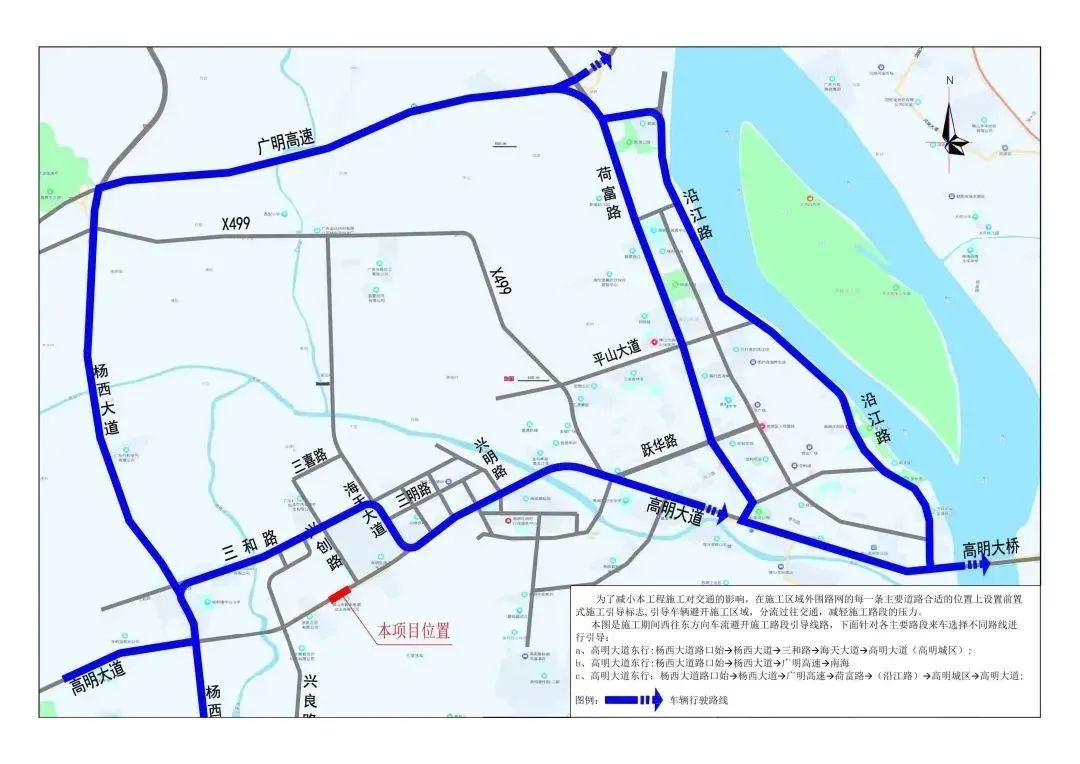 施工点:跨高明大道特大桥,位置如下图所示。施工期间日间5:00至夜间23:00主路按现有通行不变;夜间23:00至次日凌晨5:00高明大道(海天大道至兴源路段)主路双向全封闭,过往车辆及人员沿两侧辅道通行,请按现场指示提前做好线路选择。