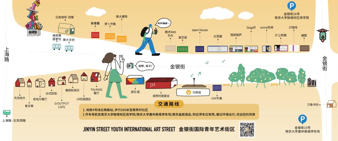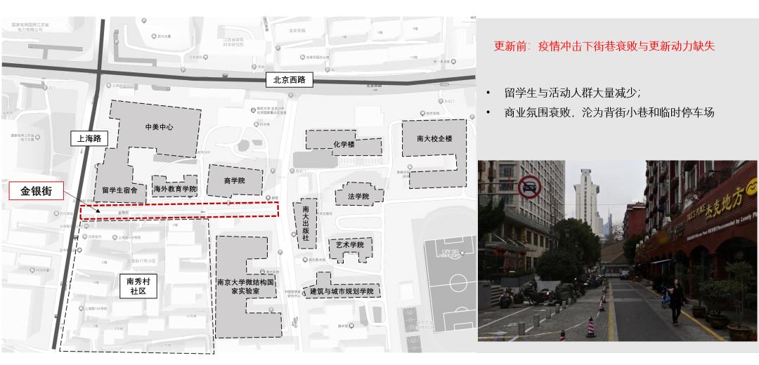 金银街是紧挨南京大学鼓楼校区西侧的一条小巷(长150M,红线平均宽4M),联通了上海路与南京大学西北门,其两侧是南京大学中美文化中心、商学院、海外教育学院、微结构国家重点实验室以及南秀村社区。虽然其周边有很好的社群资源,但是这条小巷多年来一直缺乏清晰的定位与有效的建设,除了一些沿街的小餐馆外,长期是被违章停车等充斥的空间杂乱、氛围消极的背街小巷,在疫情期间更是因为留学生流失、管控封闭而日益萧条。