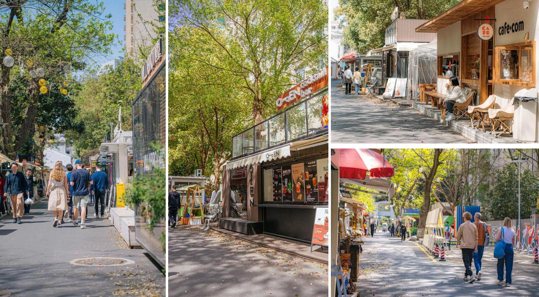 南京高校资源众多,在一些环高校周边地区利用存量资产打造了“城市硅巷”,但是金银街短小、狭窄,且其两侧并无可以拿出来“可资经营的资产”。一方面是鼓楼区政府希望以较小的投入迅速提升街巷活力,南京大学希望政府帮助整治提升校园周边环境,社区居民则希望健全日常生活圈功能;另一方面是政府有关部门的各种管制规定:例如金银街不允许去除车行交通功能,不允许建设永久性固定设施。面对着更新的多元诉求及有限的空间、受限的管制要求,显然常规自上而下、一步到位的“项目制更新”无法适用于这条小巷。在鼓楼区政府、南京大学及社区等多方协商共谋下,于2022年底开始采用临时性更新的策略方式,在很短时间内使金银街实现了脱胎换骨的蜕变,从以前一个杂乱、消极的背街小巷转变成了时尚、活力、网红的“国际青年艺术街区”。
