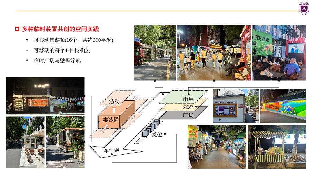 在这个过程中,鼓楼区政府对金银街更新启动“一事一议”,创造多种临时性的制度通道;委托区国企新厦集团作为具体建设实施单位,整合各方意愿诉求,向上与相关管理部门沟通对接,向下为高校、社区服务;运营公司负责金银街后续的管理运营,通过收取租金保持可持续发展;南京大学及社区则积极配合支持、参与谋划。为了不违反相关的管控规定,更新中采用了可移动集装箱、可移动摊位、临时广场、壁画涂鸦等多种临时装置,引入了快餐、咖啡、文创、市集等多种业态及不定期的交流活动,进行共创空间实践。