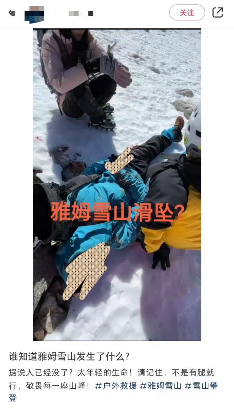 另一位目击者也表示,“装备如冰爪、冰镐之类都是有的,大概是滑坠过程中掉落了,(人)最终还是没能挺过来,希望大家不要讨论装备了,逝者为大!”