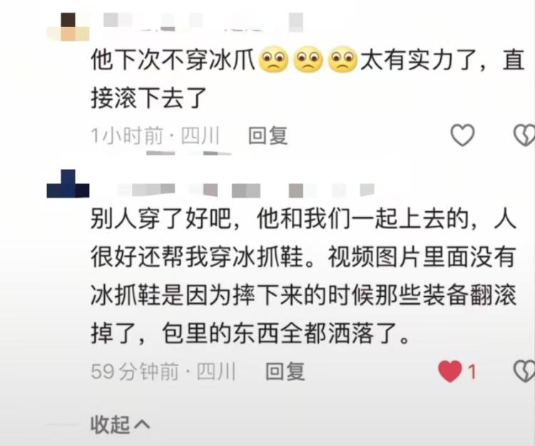 有网友发现,这名登山者的脚上并没有穿着冰爪,质疑其装备不全。不过有自称其队友的网友表示,“别人是穿了的好吧,他和我们一起上去的,人很好还帮我穿冰抓鞋。视频图片里面没有,是因为摔下来的时候那些装备翻滚掉了,包里的东西也全都洒落了。”