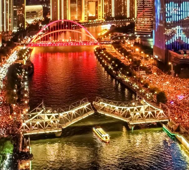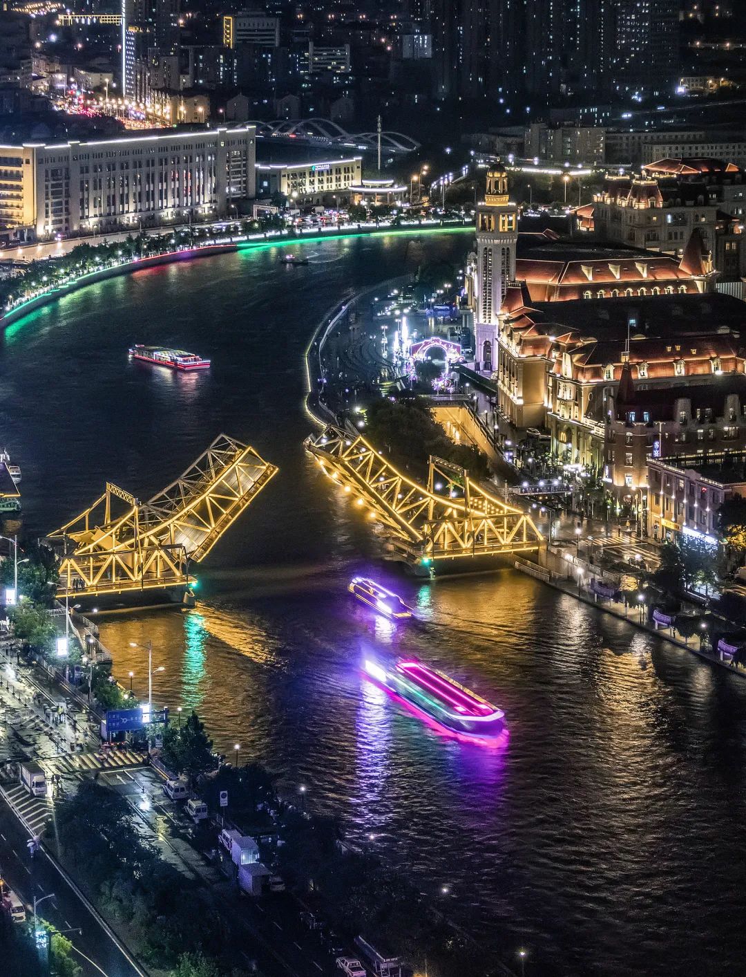 海河,一条惬意河夜幕低垂,游舫穿梭