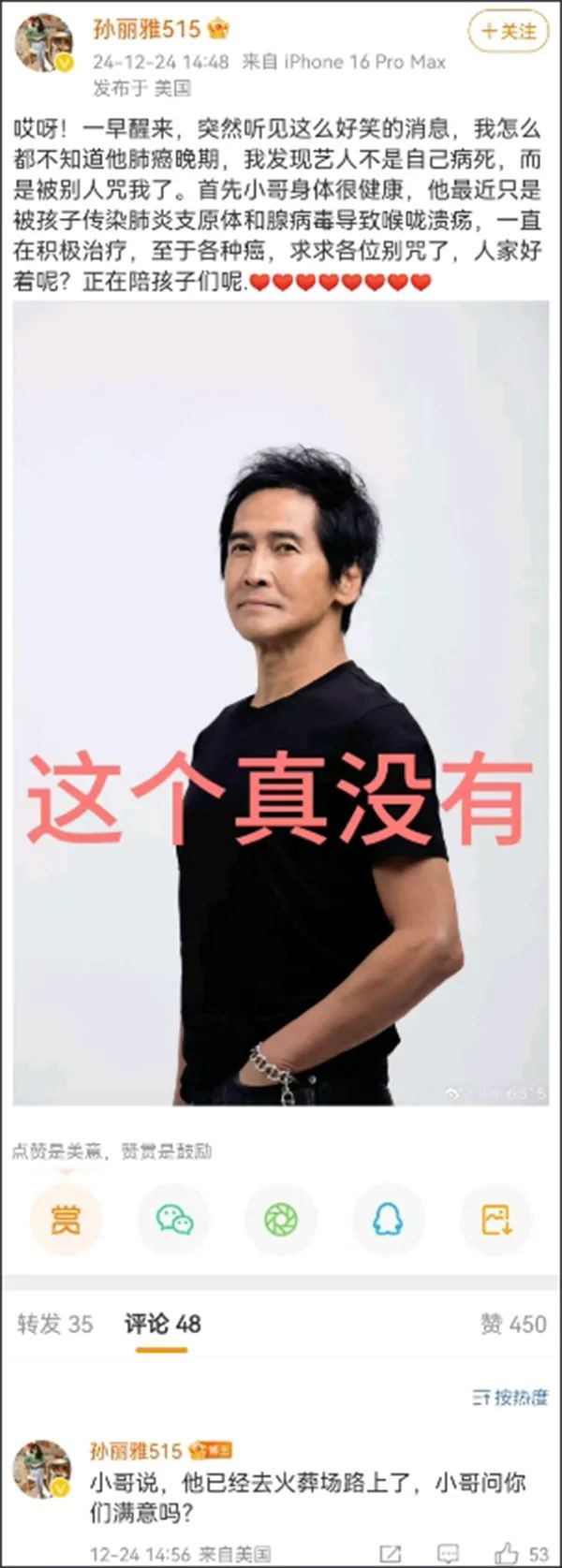 齐秦妻子@孙丽雅515 24日发文澄清称,齐秦身体很健康,最近只是被孩子传染肺炎支原体和腺病毒导致喉咙溃疡,一直在积极治疗,“至于各种癌,求求各位别咒了”。