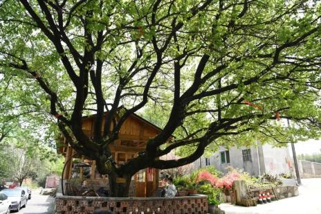 游客在繁茂的杏树下