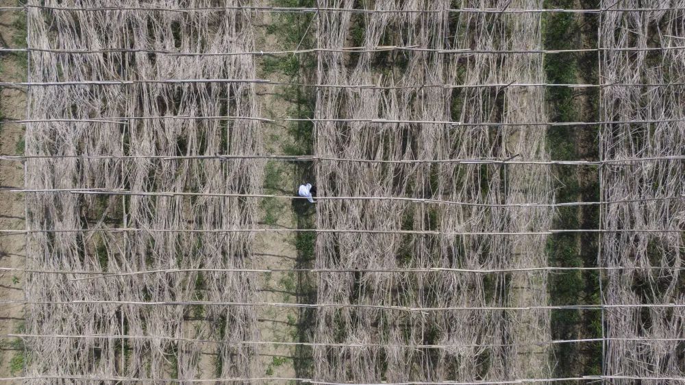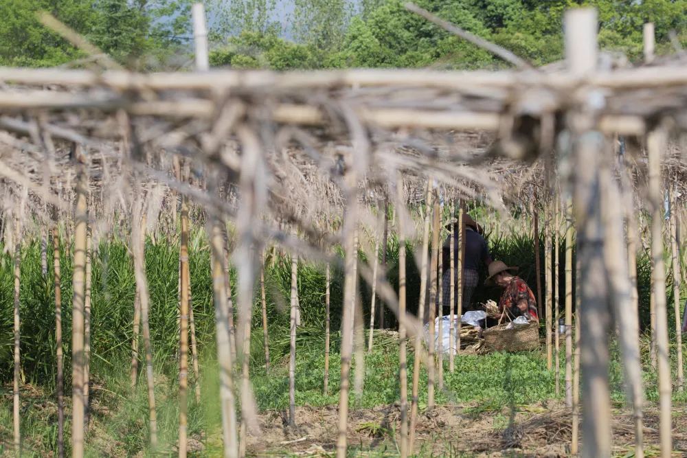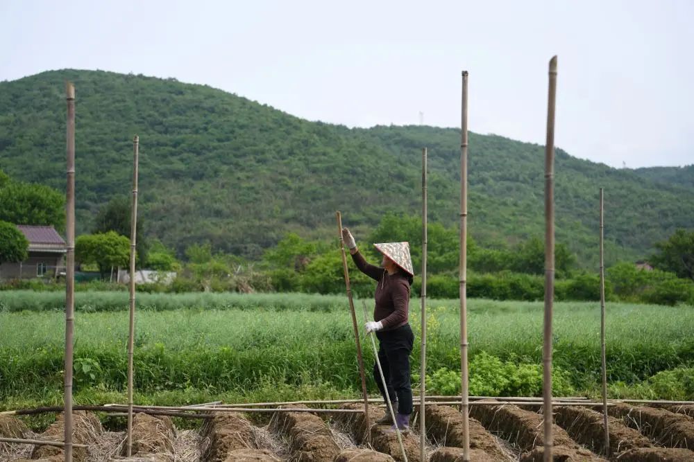 4月20日,村民江桂芳在给种下的铜陵白姜搭建姜棚。