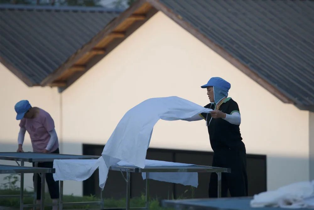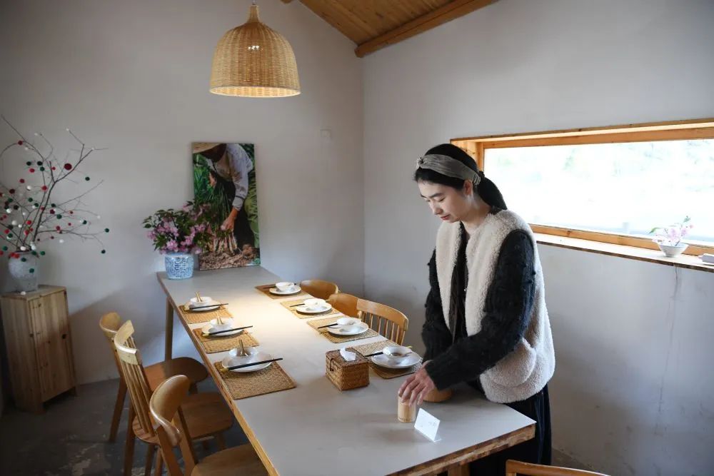 4月4日,胡婷婷在整理山礼乡村会客厅的餐厅桌面。