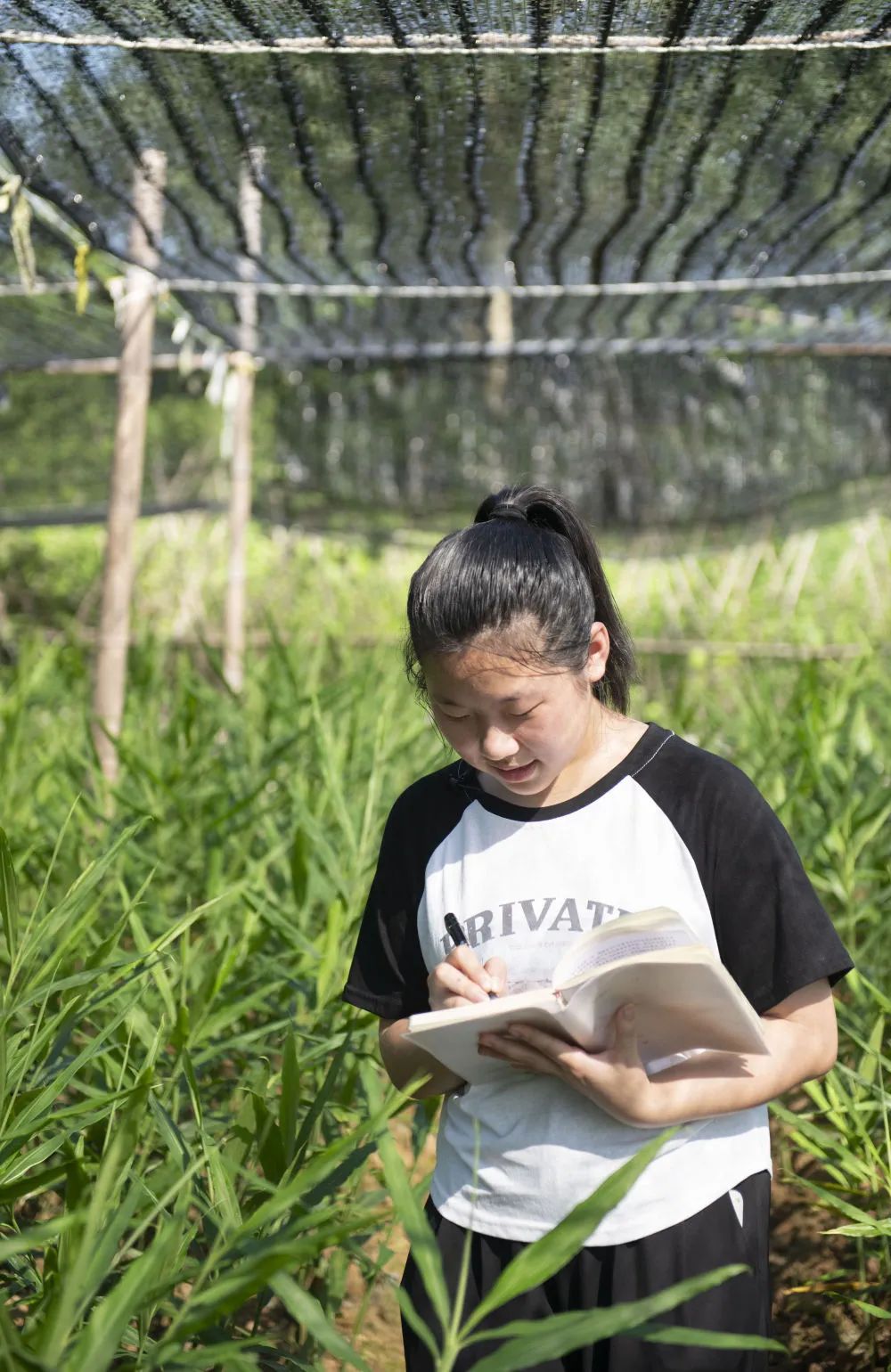 早上七点,家住铜陵市义安区天门镇新华村的15岁女孩朱晴雨出现在自家的白姜田里。“随着姜苗逐渐长大,它们越来越需要阳光,我们就把遮阳网一层层撤掉。”说起白姜的种植要点,朱晴雨如数家珍。她的爷爷朱树清正在田里给姜苗培土,朱晴雨在一旁观察姜苗的叶片状态,不时在笔记本上记上几笔。笔记本里记录了白姜种植的各种知识,除了图片和文字摘录,也有不少她的想法心得。