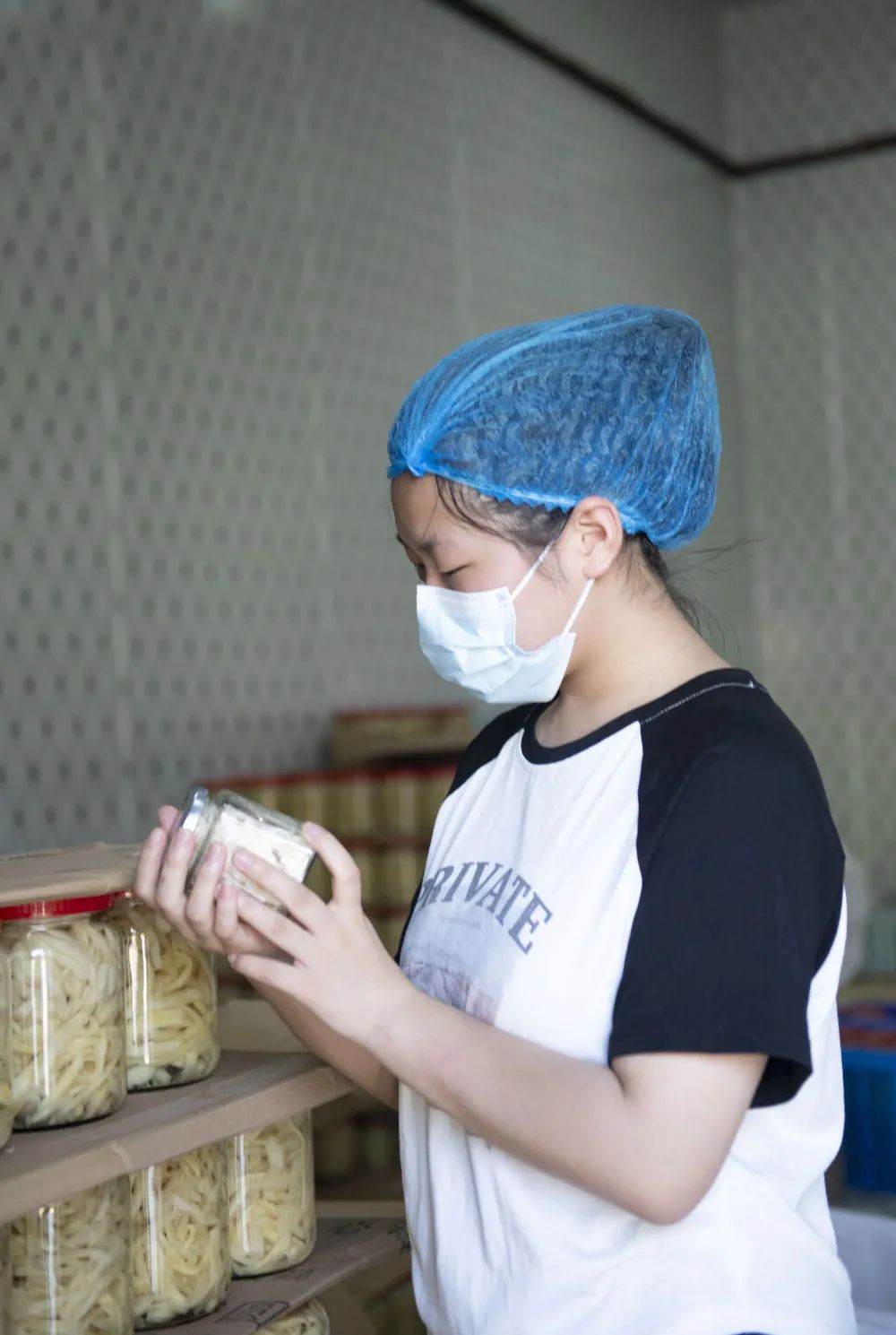 7月24日,在安徽省铜陵市义安区天门镇,朱晴雨(右)在铜陵阿朵白姜发展有限公司灌装间了解白姜灌装流程。新华社记者 张端 摄