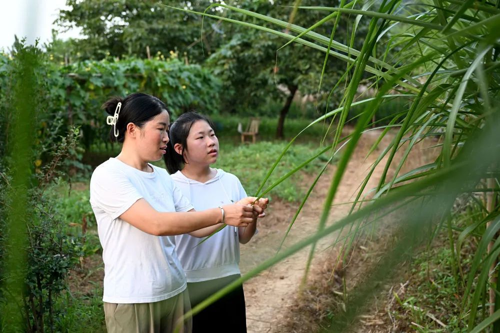 7月23日,在安徽省铜陵市郊区大通镇大院村,朱晴雨(右)向妈妈请教芭茅草的特点。新华社记者 傅天 摄