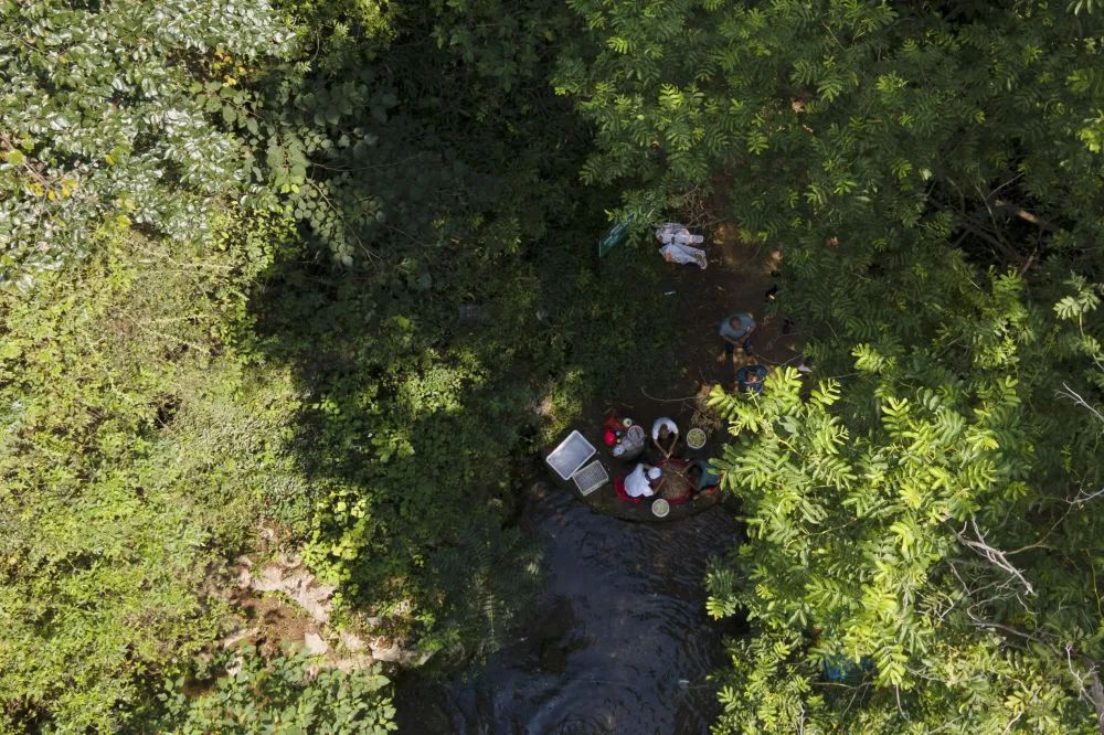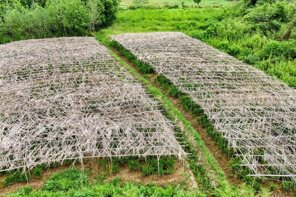 7月23日,在安徽省铜陵市义安区天门镇龙山村,朱晴雨在采用芭茅搭棚遮阴传统方法的白姜田里劳作(无人机照片)。新华社记者 傅天 摄