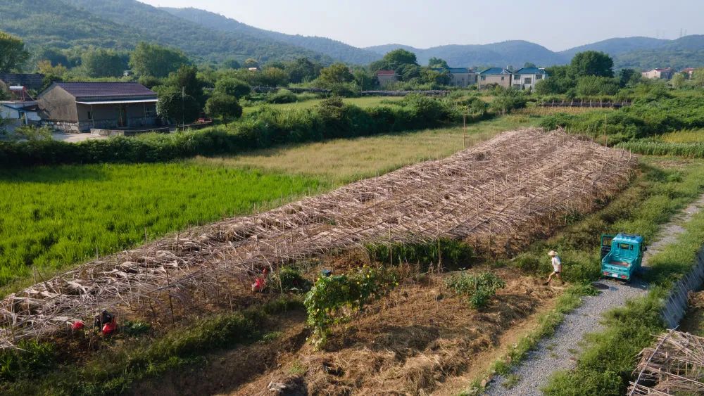 11月7日,当日是立冬,在安徽省铜陵市郊区大通镇大院村,村民准备把姜种放入姜阁中(无人机照片)。