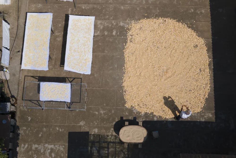 9月1日,在安徽省铜陵市郊区大通镇大院村山礼白姜工坊门前,工作人员在晾晒白姜(无人机照片)。新华社记者 张端 摄