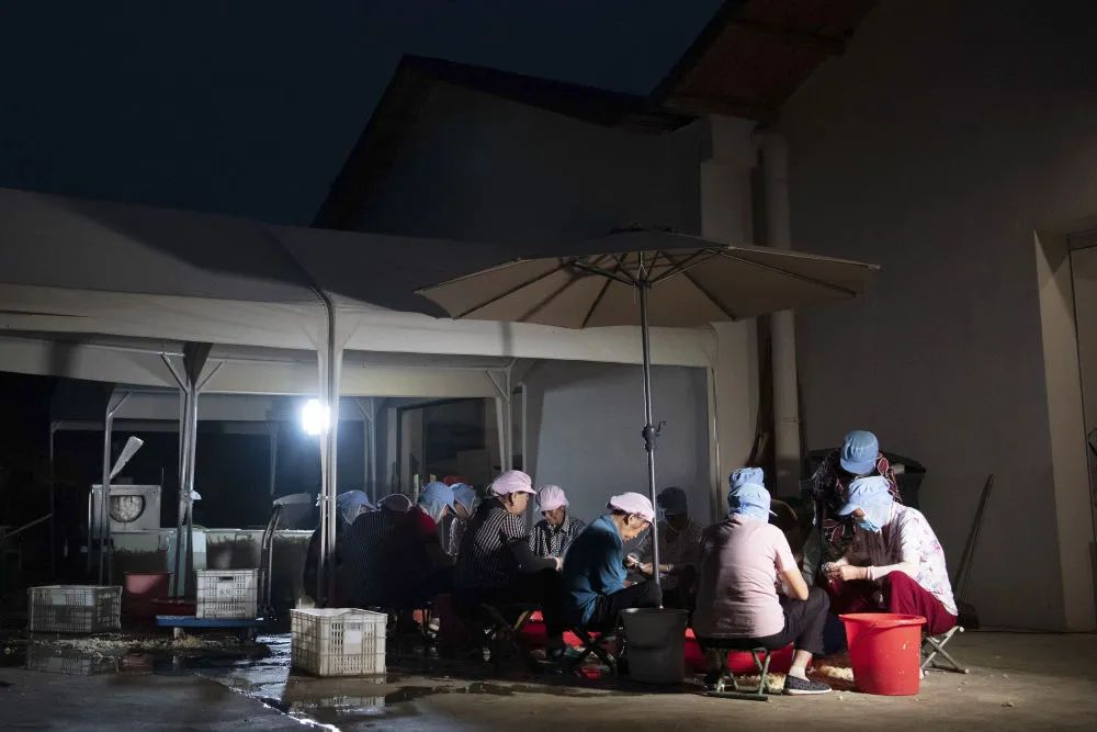 9月14日晚,在安徽省铜陵市郊区大通镇大院村山礼白姜工坊门前,工作人员在加工铜陵白姜。新华社记者 张端 摄