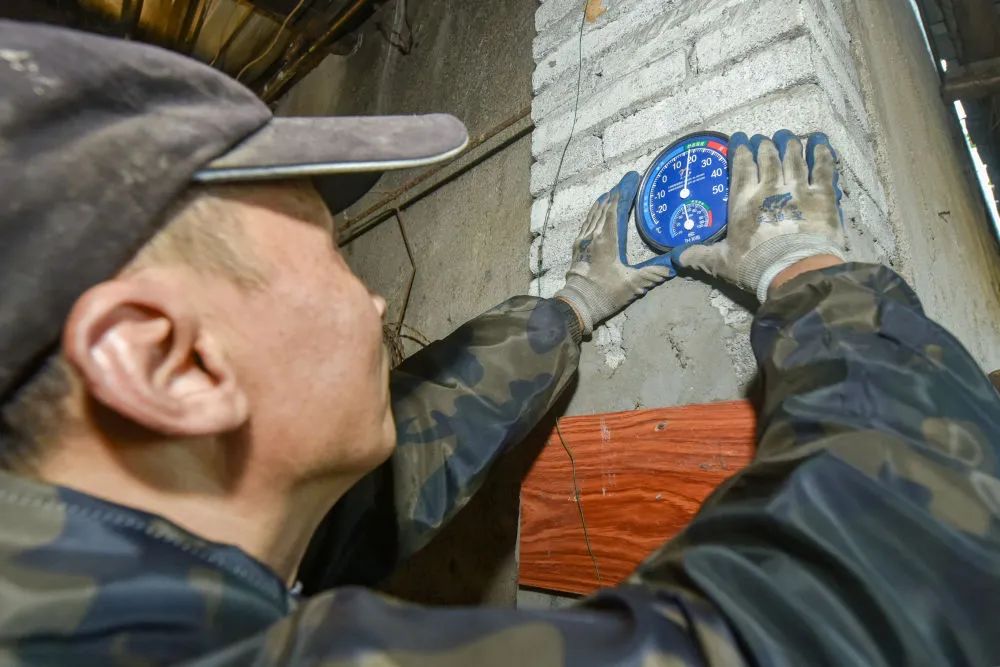 11月11日,在安徽省铜陵市义安区天门镇五峰村,“姜把式”盛义武整理挂在姜阁外墙上的温湿度计。