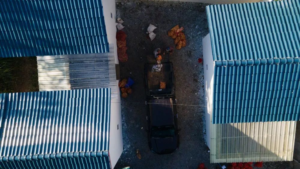 8月31日,在安徽省铜陵市郊区大通镇大院村山礼白姜工坊门前,工作人员在晾晒白姜(无人机照片)。新华社记者 张端 摄
